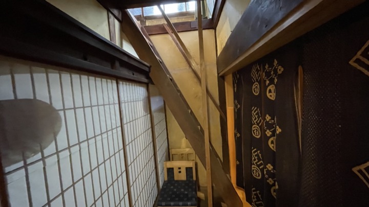 昔の階段はとっても急です。宿泊のお部屋は全て2階なので、手すりにつかまって気をつけて上り下りしましょう。